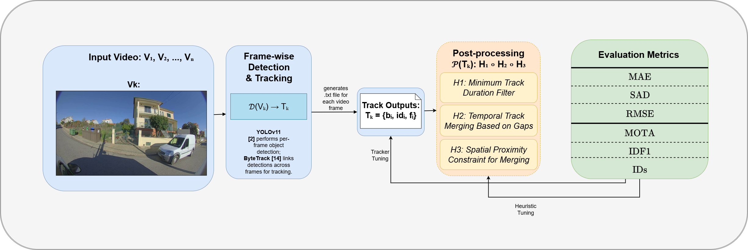Download Segmentation DataTo improve tracking and counting, we introduce a set of heuristic rules applied as a post-processing step. These include a minimum track duration filter to remove noisy, short-lived tracks; a temporal merging rule to reconnect tracks fragmented by brief occlusions; and a spatial proximity constraint to ensure that merged tracks correspond to the same physical object.